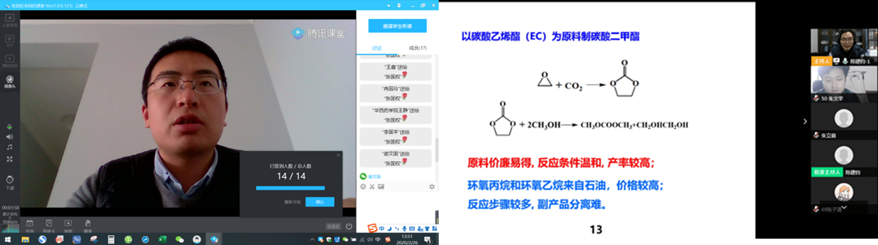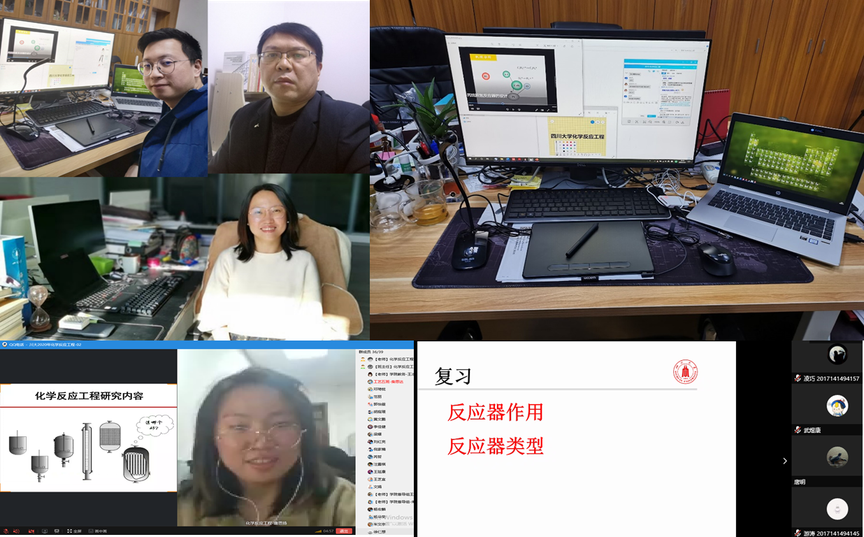 化学反应工程教研组在党员唐盛伟副院长和党员袁绍军系主任的带领下,第一时间梳理了教学计划,多维度丰富课程资源,升级教学硬件,多次谨慎演练授课,保障网络课堂顺利开展。