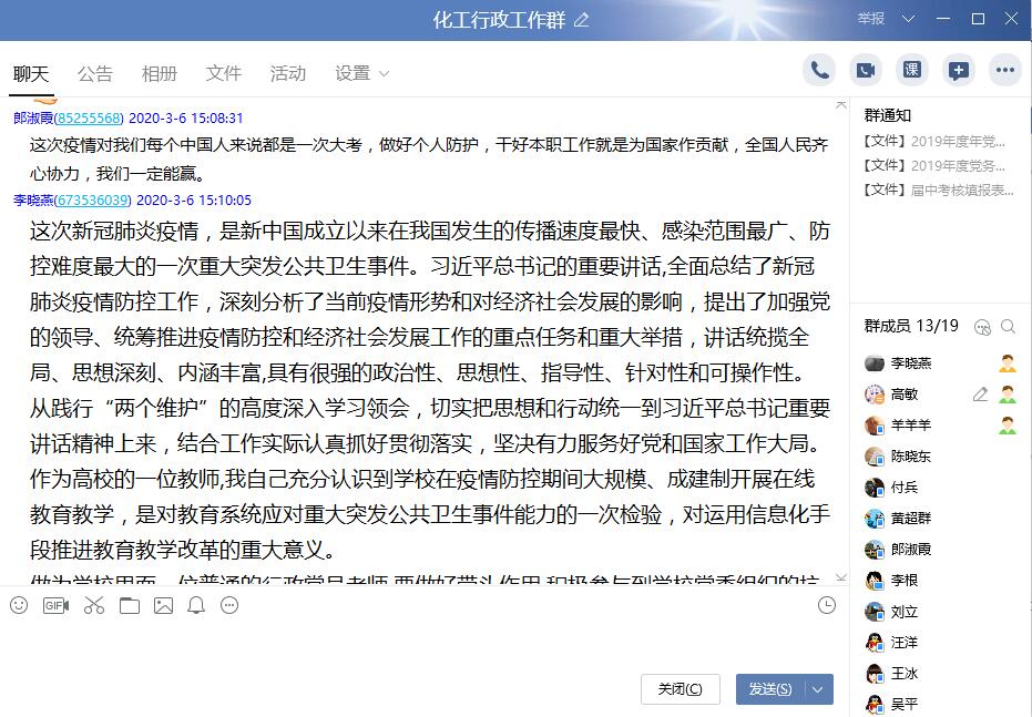 “化工行政工作群”逐渐热络起来。在高敏老师的主持下,大家结合前期的学习,畅谈自己的学习心得和体会。有的老师说到:“做为学校里面一位普通的行政党员老师,要做好带头作用,积极参与到学校党委组织的抗击疫情工作中,尽一份自己绵薄之力,共迎春天的到来”。有的老师说到:“作为一名普通党员,我们首先要遵守疫情期间相关规定,不给国家添乱;其次,我们要在群众中树立战胜疫情的信心;第三,我们要时刻关注官方报道,学习疫情相关知识,增加对疫情的了解,不胡乱恐慌;第四,我们要学会理性的看待问题,不信谣,不传谣,不添堵;第五,我们要听党指挥,听从指导,干好自己的工作,坚守岗位。”大家纷纷表示,我们要从践行“两个维护”的高度深入学习领会,切实把思想和行动统一到习近平总书记重要讲话精神上来,结合工作实际,认真抓好贯彻落实,坚决有力服务好党和国家工作大局。