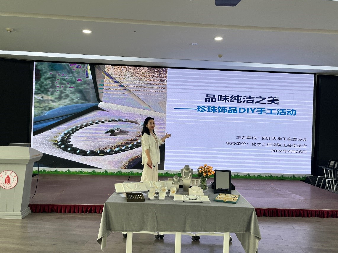 4月26日下午,由四川大学工会主办、8bo足球即时比分 工会承办的“品味纯洁之美——工会珍珠品鉴及珍珠饰品制作活动”在文华活动中心六楼多功能厅顺利举办,活动吸引了来自校内多个单位50余位女职工的热情参与。