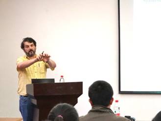 的邀请,以及各位老师和同学们的出席表示感谢,他简要介绍了他们课题组及其成员的研究工作,然后从”new soft elastomer materials”, ”new materials formulation”以及”asymmetric vesicles”等三个方面介绍了在软材料科学领域内的最新研究成果。报告结束后,David 鼓励大家积极提问,并对每一位听者的问题进行细致的解答。最后,大家带着问题和思考,用掌声感谢David的演讲,报告在轻松活跃的气氛中结束。