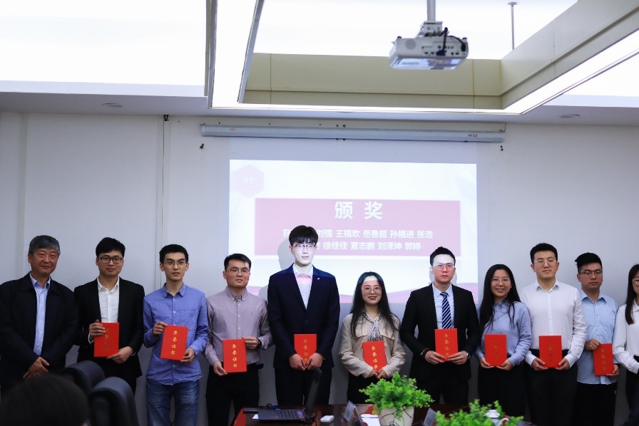 在老师和同学们热烈的掌声中,黄超经理,庞国伟书记,贾秀娥副秘书长为10位获奖学生颁发奖状并合影留念。