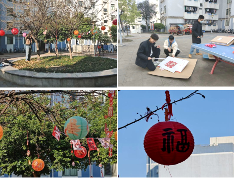 此外,同学们在树木间挂满了五彩斑斓的灯笼,贴上喜庆的“福”字,经过大家一番精心的布置,整个学生社区焕然一新,洋溢着浓浓的节日氛围,让置身于忙碌学习和生活中的同学们感受到了温馨与喜悦。
