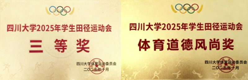 的运动健儿们凭借卓越的表现、顽强的斗志与团结的精神,不仅在团体总分和多个单项上荣获佳绩,更以出色的组织与昂扬的风貌,荣膺“四川大学2025年学生田径运动会三等奖”“体育道德风尚奖”,实现运动成绩与精神文明的双丰收!