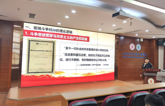 随后,2021级博士张涛先从理论逻辑、历史逻辑、现实逻辑三个层面对斗争精神进行了系统阐述。张涛先以理论解释实践,用实践证明内涵道理,通过大量生动的案例细致入微地引导同学们认识斗争精神,并号召同学们坚持发扬敢于斗争、善于斗争的精神,砥砺前行。