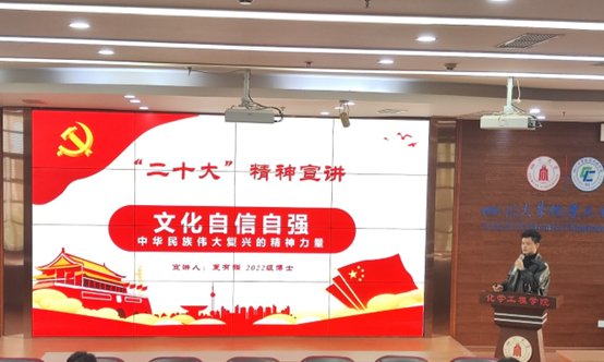 在深刻体悟斗争精神后,2022级博士夏有强为同学们介绍了中华民族伟大复兴的精神力量——文化自信自强。在宣讲中,夏有强主要从五个方面,由表及里阐述了增强社会主义文化自信的重要意义以及在推进文化自信自强过程中所需付出的努力,呼吁同学们让文化自信自强成为新时代的核心精神力量。